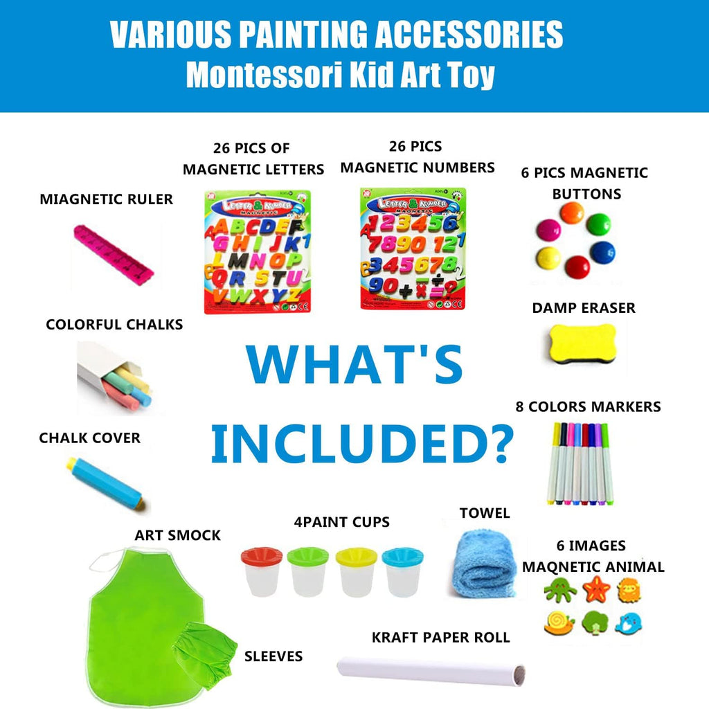 Rich Accessories Included: Comes with a 500cm white paper roll, 4 drawing cups, magnetic rules, 8 markers, dust-free chalk, a chalk case, a washable eraser, colorful magnetic letters and numbers, and more.