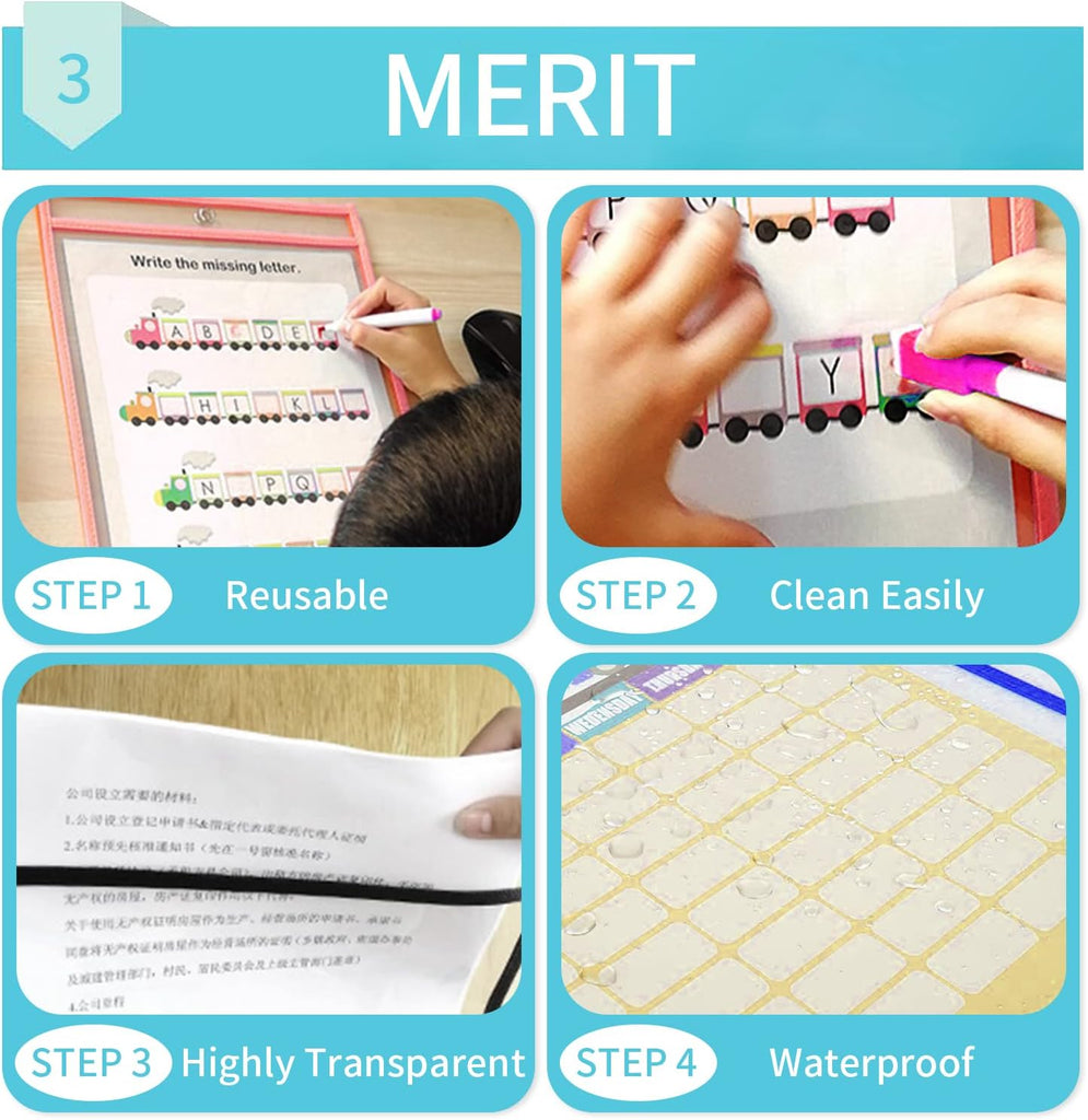 Economical & Eco-Friendly: Reduce paper use and save money with our dry erase sleeves, which are clear, waterproof, and compatible with both dry and wet erase markers.