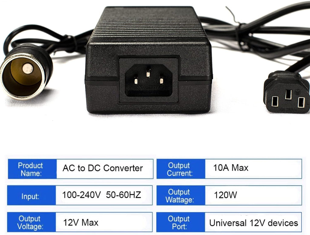 12V 10A 120W AC/DC Car Power Converter, transform 110-240V AC from Wall Plug into 12V DC for Car charger or Car lighter Plug in, bring your car appliances back home to use conveniently, which means you can save many money.